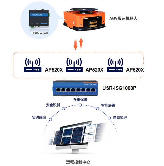 ●无线层:AP部署于仓库顶部,USR-W660安装在AGV顶部天线罩内,实现-65dBm低信号强度下的稳定通信。