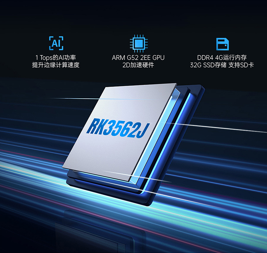 硬件架构:四核64位ARM Cortex-A53处理器,主频2.0GHz,集成1.0TOPS算力NPU;