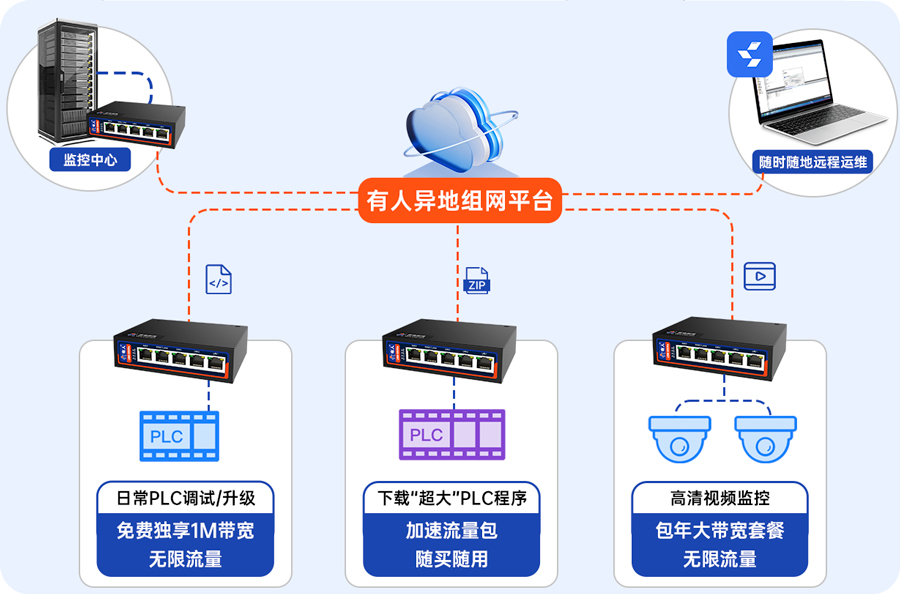 - 每台网关均免费独享1M组网带宽,畅享无限流量,满足大部分PLC运维场景